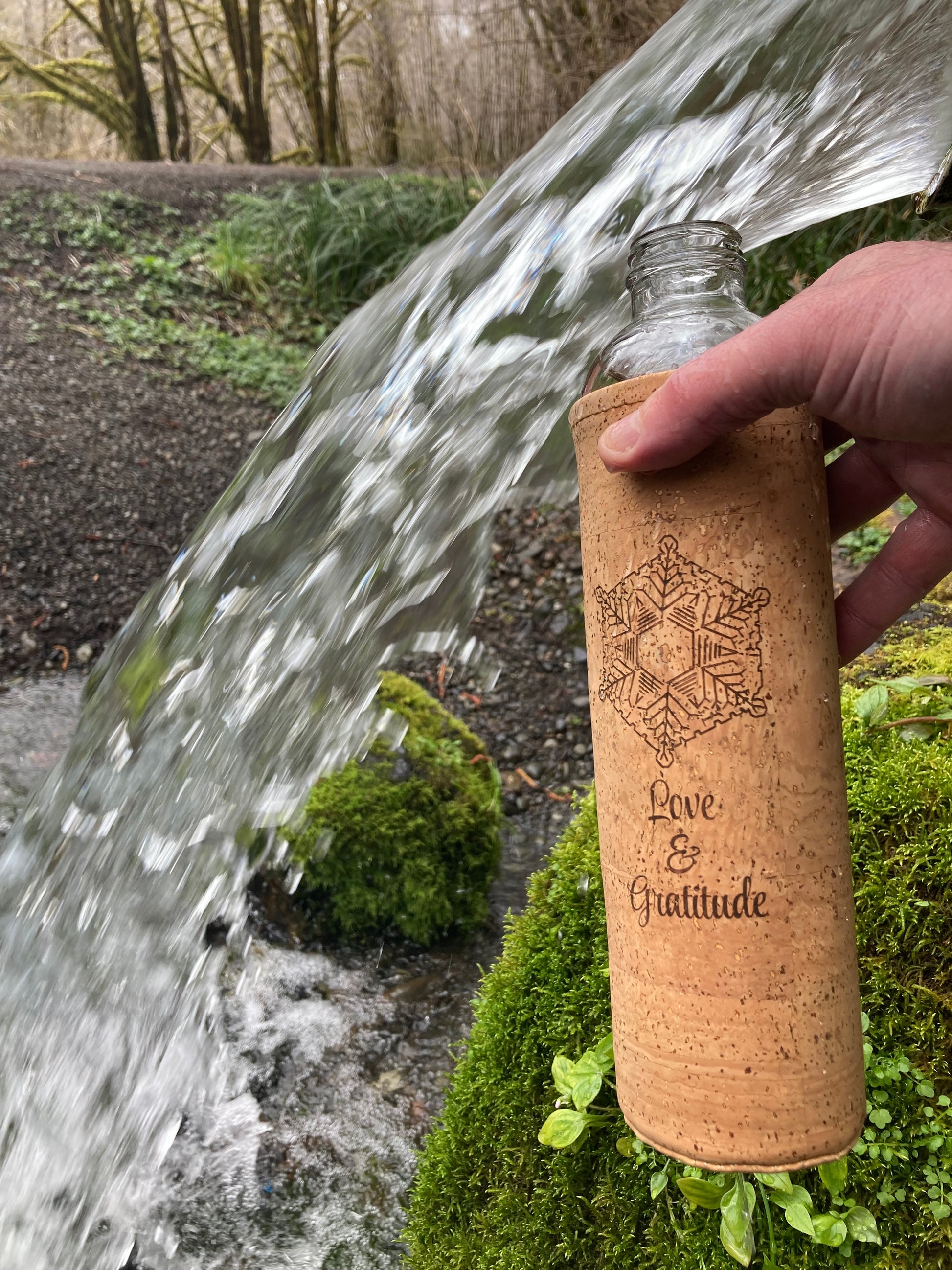 The Flaska bottle uses the innovative Glass & Vibe technology to structure water, making it more similar to spring water. The hand-crafted cork sleeve, featuring the Love & Gratitude cosmogram inspired by Dr. Masaru Emoto, adds a touch of elegance and meaning to the bottle. While the cosmogram design enhances the aesthetic appeal, the cork sleeve provides excellent protection and insulation for your Flaska.
