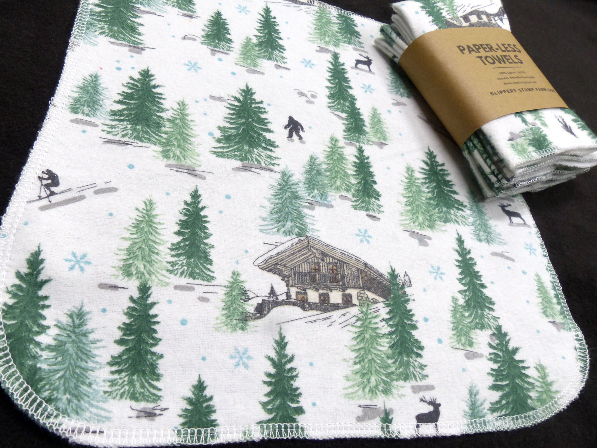 Made with cotton flannel fabric available in many fun prints. Each Paper LESS towels is handmade at Slippery Stump Farm, in the USA, Washington State.